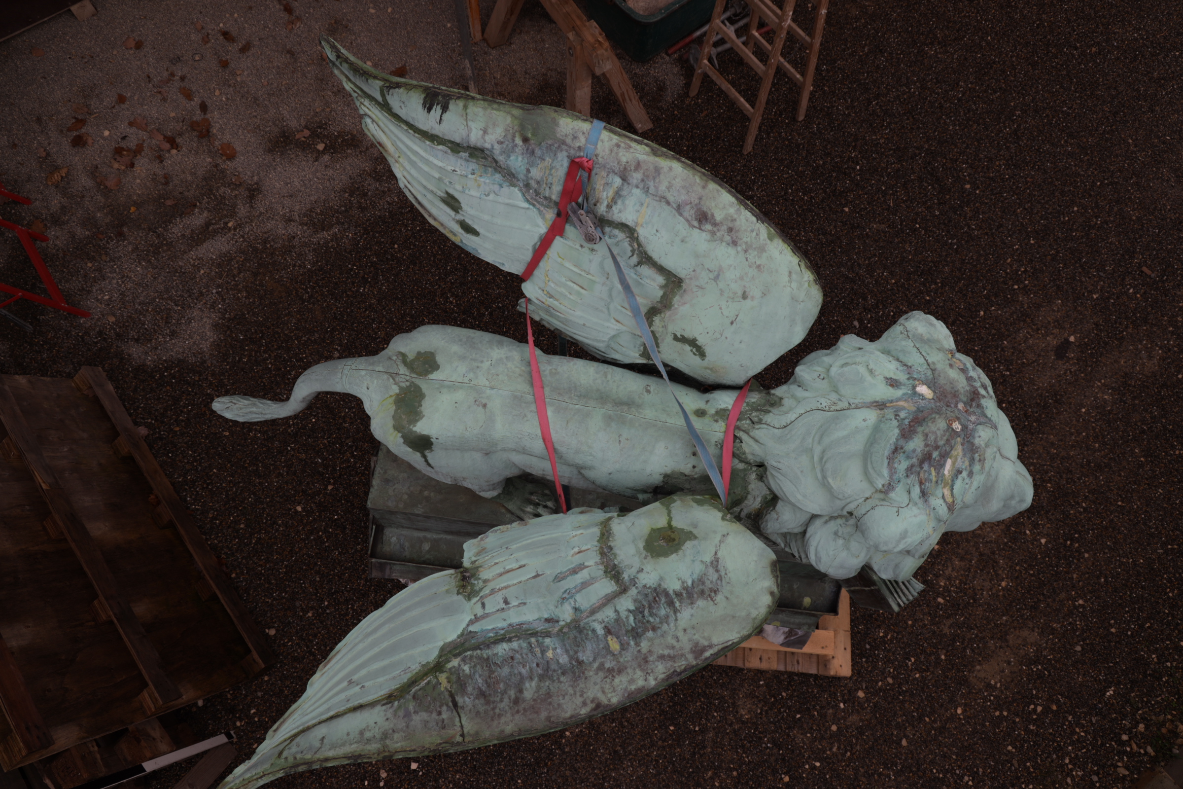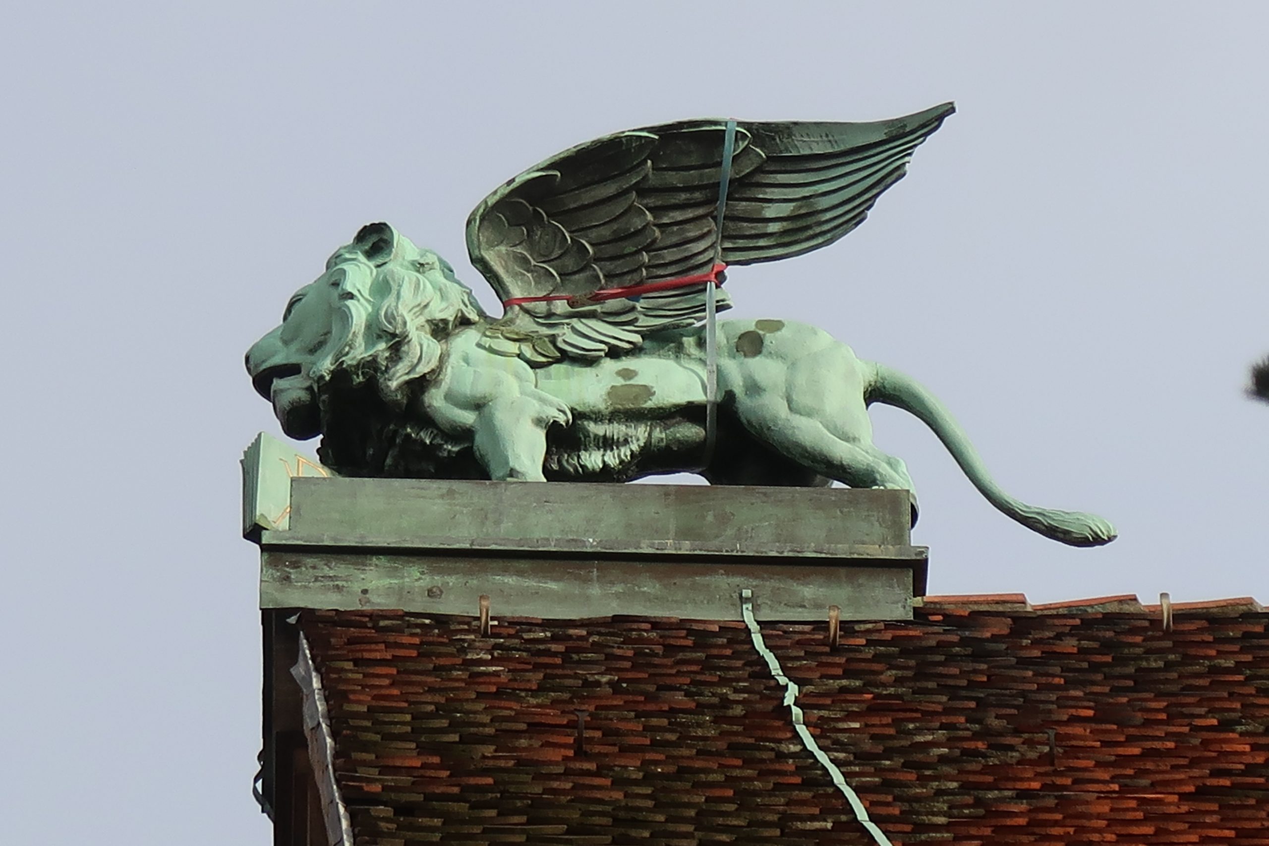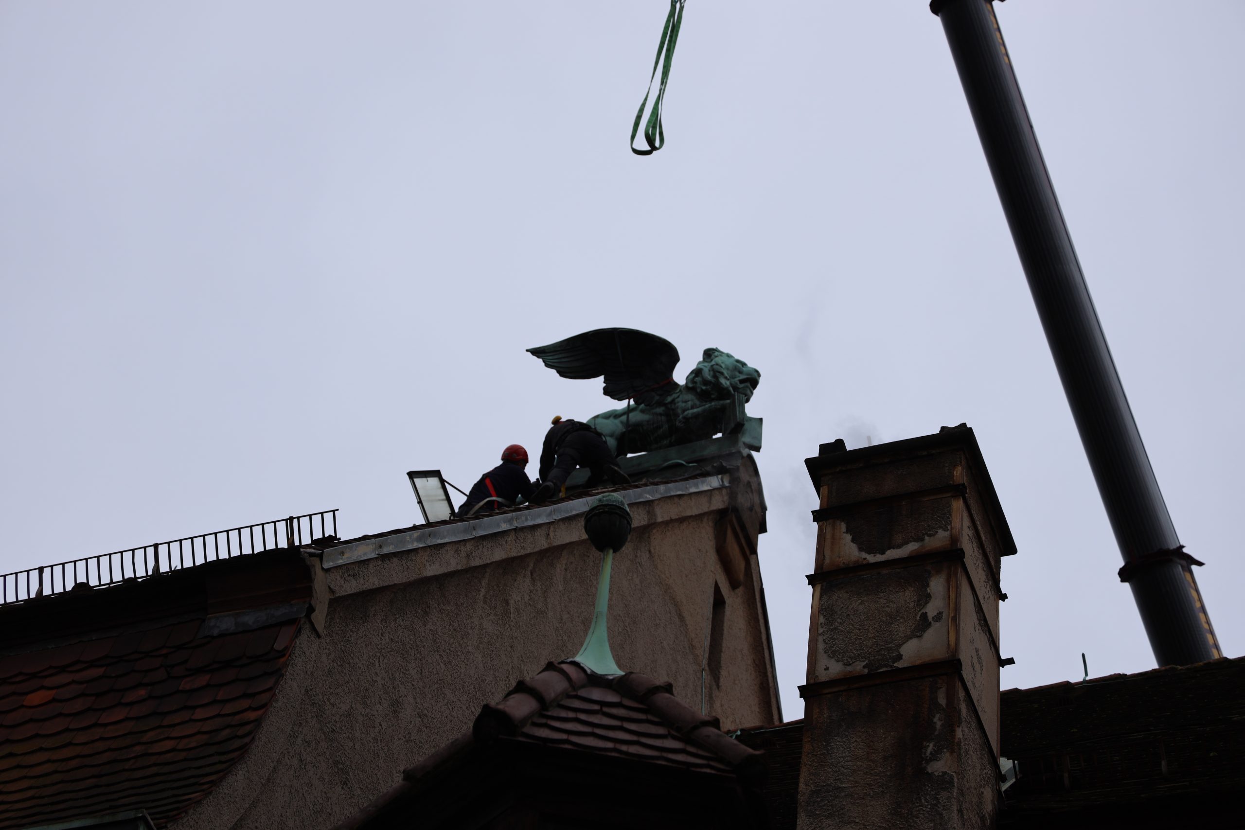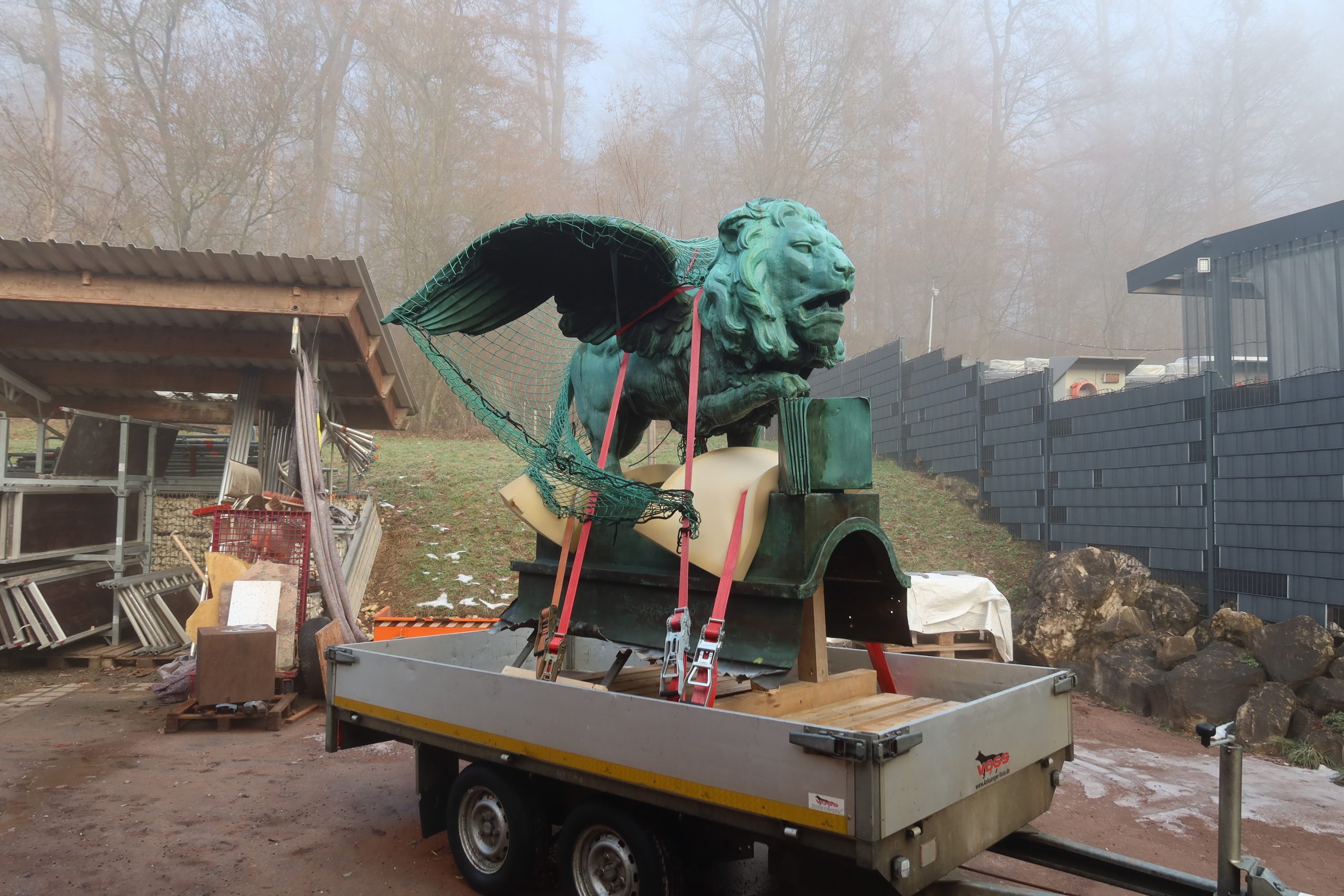 Nachdem festgestellt wurde, dass die Löwenskulptur zunehmend stark im Wind wackelte, wurde entschieden diese zur Sicherheit zu bergen. Nach einer umfangreichen Voruntersuchung und intensiver Abstimmung mit dem Landesamt für Denkmalpflege konnten die bestehenden Schäden durch einen Metallrestaurator behoben werden. Zusätzlich wurde eine Verstärkung des innenliegenden Skeletts und der Flügel angebracht. Im Juli 2025 erfolgte in einer Gemeinschaftsaktion von Metallrestaurator und einem Team von AeDis die Wiederaufstellung unter großem öffentlichem Interesse.